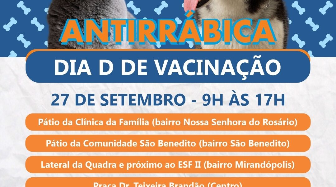A Prefeitura de Quatis já divulgou o Dia D da vacinação antirrábica no município. A ação acontecerá no dia 27 de setembro, em um sábado, das 9h às 17 horas. A imunização, que garante a proteção de cães e gatos contra a raiva, será realizada pela equipe da Divisão de Saúde e Bem-Estar Animal, da prefeitura, que estará em cinco