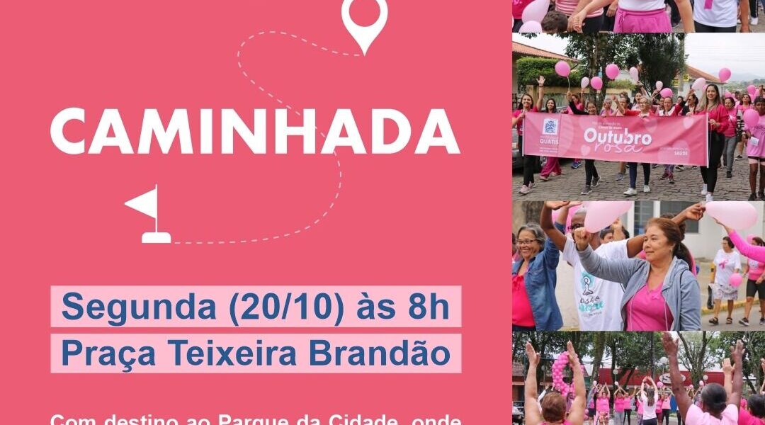 A Prefeitura de Quatis vai realizar, na próxima segunda-feira, 20, a caminhada Outubro Rosa, em alusão ao mês de prevenção ao câncer de mama. A saída será às 8 horas da Praça Dr. Teixeira Brandão, no Centro, em sentido ao Parque da Cidade, no Jardim Polastri, onde haverá uma palestra sobre o tema, com a presença de munícipes que já