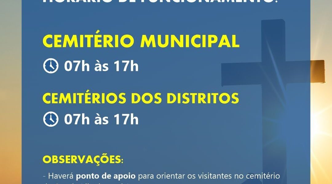 A Prefeitura Municipal de Quatis informa que neste feriado de Finados, 02 de novembro, os cemitérios do município funcionarão das 07h às 17h. Ressaltamos que haverá ponto de apoio para orientar os visitantes do Cemitério de Quatis. Orientamos também aos visitantes que evitem deixar recipientes vazios que possam servir de criadouros para o mosquito Aedes Aegypti.