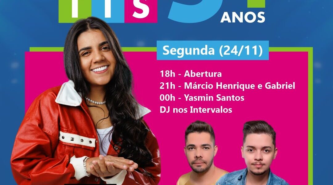 A nossa festa continua nesta segunda-feira (24), noite de véspera de aniversário da cidade. A Feira da Roça recebe ninguém mais e ninguém menos que YASMIN SANTOS. A cantora, que é uma das principais vozes femininas do sertanejo atual, chega para fazer aquela festa que a galera ama, com o melhor do gênero. Mas a festa ainda promete muito mais
