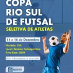 Vai começar as seletivas para a Copa Rio Sul de Futsal de 2026! A seletiva acontecerá em duas etapas e o objetivo é selecionar os jogadores que representarão o município de Quatis no torneio. Fique ligado nas datas, horário e local de realização das seleções: 11 e 16 de dezembro (quinta e terça-feira)19hGinásio Poliesportivo João Batista de Oliveira (Ginásio Municipal)