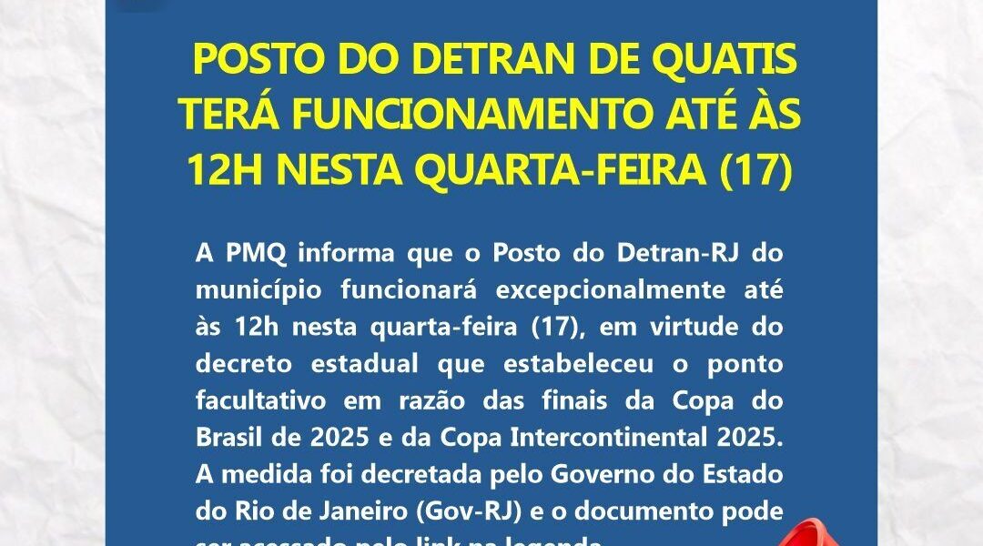 A Prefeitura de Quatis informa que o Posto do Detran-RJ do município funcionará excepcionalmente até às 12h nesta quarta-feira (17), em virtude do decreto estadual que estabeleceu o ponto facultativo em razão das finais da Copa do Brasil de 2025 e da Copa Intercontinental 2025. A medida foi decretada pelo Governo do Estado do Rio de Janeiro (Gov-RJ) e o