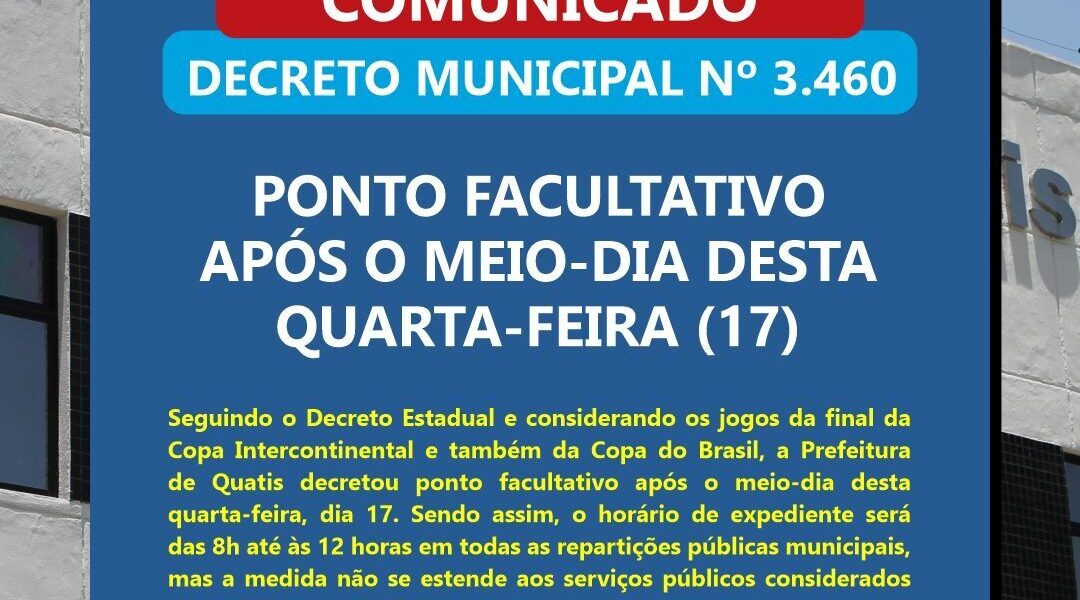 Seguindo o Decreto Estadual e considerando os jogos da final da Copa Intercontinental e também da Copa do Brasil, a Prefeitura de Quatis decretou ponto facultativo após o meio-dia desta quarta-feira, dia 17. Sendo assim, o horário de expediente será das 8h até às 12 horas em todas as repartições públicas municipais, mas a medida não se estende aos serviços