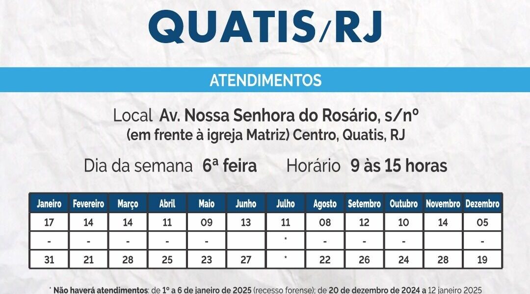Nesta sexta-feira, dia 19, o ônibus da Justiça Itinerante estará em Quatis, pela última vez no ano, com atendimentos jurídicos. De acordo com o calendário, os dias de funcionamento do serviço são somente nas sextas-feiras de cada mês, com exceção dos meses com recessos e feriados. Os atendimentos acontecem das 9h às 15 horas, na Avenida Nossa Senhora do Rosário,