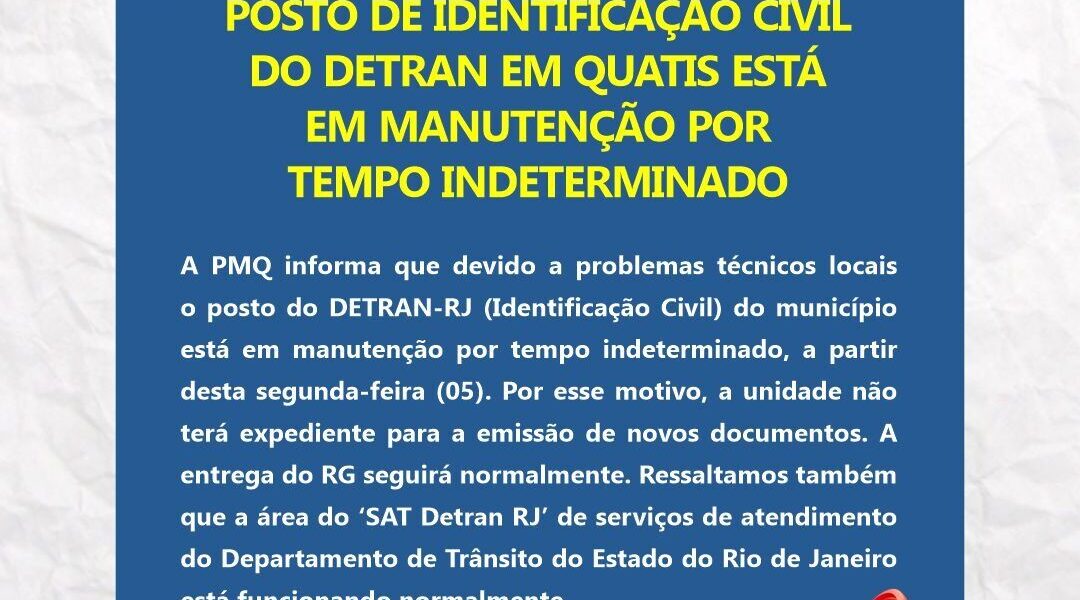 A Prefeitura de Quatis informa que devido a problemas técnicos locais o posto do DETRAN-RJ (Identificação Civil) do município está em manutenção por tempo indeterminado, a partir desta segunda-feira (05). Por esse motivo, a unidade não terá expediente para a emissão de novos documentos. A entrega do RG seguirá normalmente. Ressaltamos também que a área do ‘SAT Detran RJ’ de