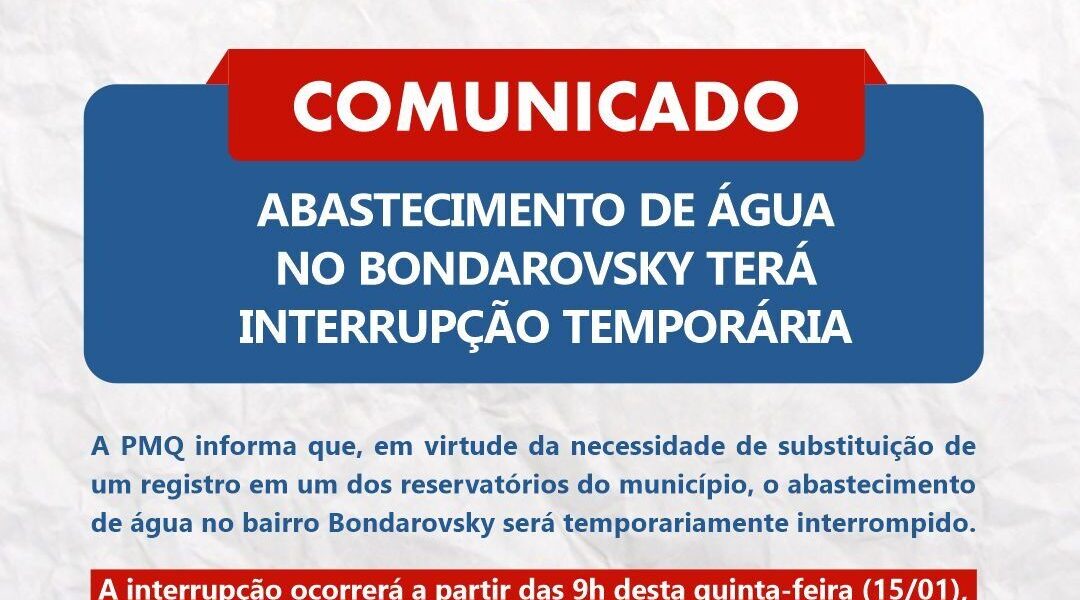 A Prefeitura de Quatis informa que, em virtude da necessidade de substituição de um registro em um dos reservatórios do município, o abastecimento de água no bairro Bondarovsky será temporariamente interrompido. A interrupção ocorrerá a partir das 9h desta quinta-feira (15/01), com previsão de retorno às 15h do mesmo dia. Contamos com a colaboração da população para que faça uso