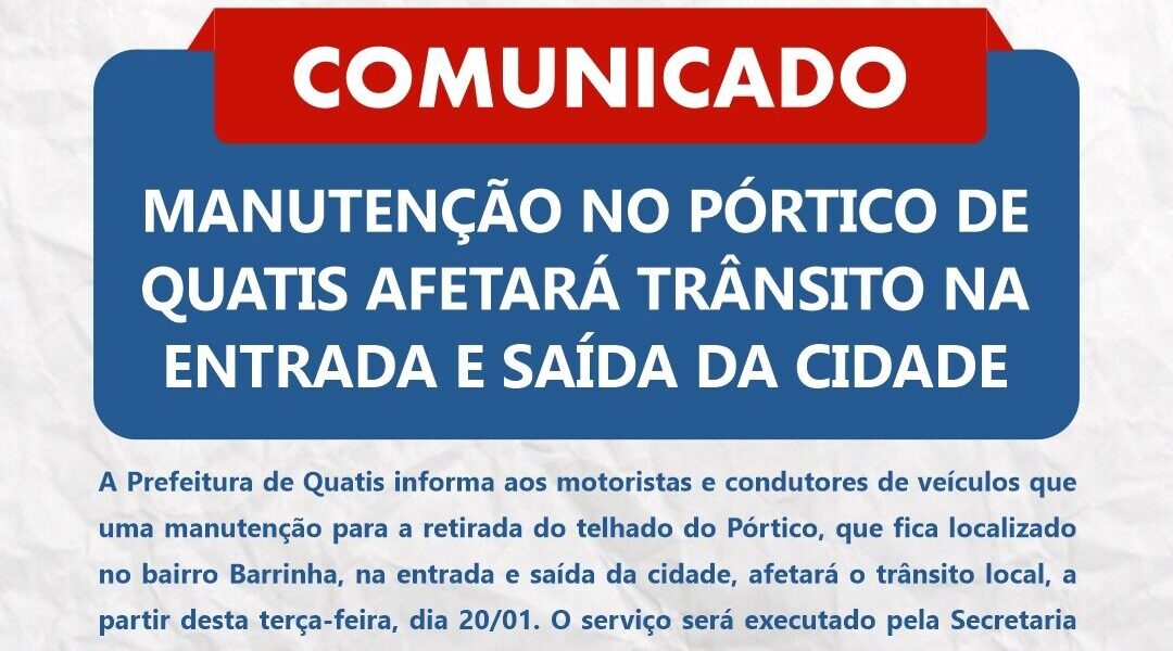 Atenção! A Prefeitura de Quatis informa aos motoristas e condutores de veículos que uma manutenção para a retirada do telhado do Pórtico, que fica localizado no bairro Barrinha, na entrada e saída da cidade, afetará o trânsito local, a partir desta terça-feira, dia 20/01. O serviço será executado pela Secretaria Municipal de Infraestrutura (SMI), com previsão de término na próxima