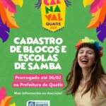 Ainda não conseguiu inscrever o seu bloquinho para o carnaval? Então, fique ligado, folião: O período de cadastramento dos blocos de rua para o Carnaval Quatis 2026 foi prorrogado. Os interessados em colocar os seus bloquinhos nas ruas durante a folia agora terão até a próxima sexta-feira, dia 06/02, para se inscrever e receber apoio e autorização para o desfile
