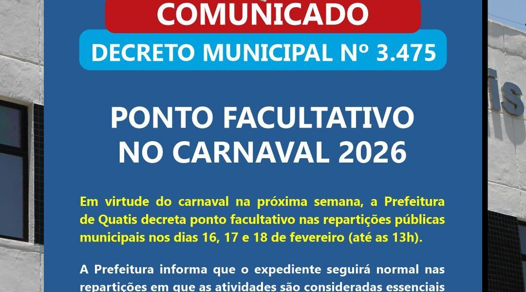 Em virtude do carnaval na próxima semana, a Prefeitura de Quatis decreta ponto facultativo nas repartições públicas municipais nos dias 16 (segunda-feira), 17 (terça-feira) e 18 de fevereiro (quarta-feira de cinzas até as 13h). A Prefeitura informa que o expediente seguirá com o calendário normal nas repartições em que as atividades são consideradas essenciais ao atendimento e prestação de serviços