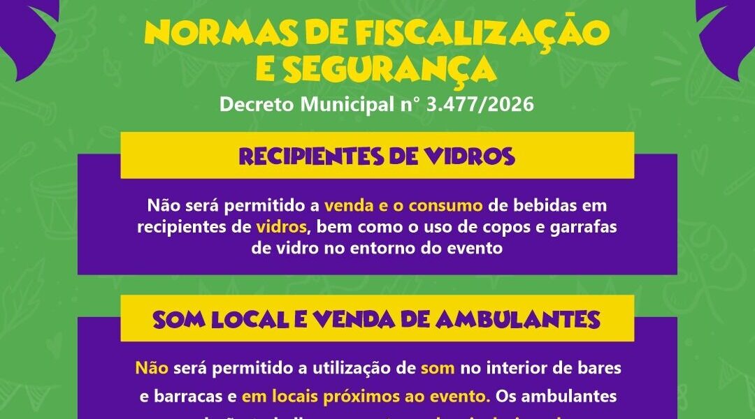 Atenção, foliões e vendedores! Confira as normas de fiscalização e segurança durante o Carnaval Quatis 2026, segundo o Decreto n° 3.477! Não será permitido a venda e o consumo de bebidas em recipientes de vidros, bem como o uso de copos e garrafas de vidro no entorno do evento ou em ruas e locais que estejam recebendo a festividade; Não