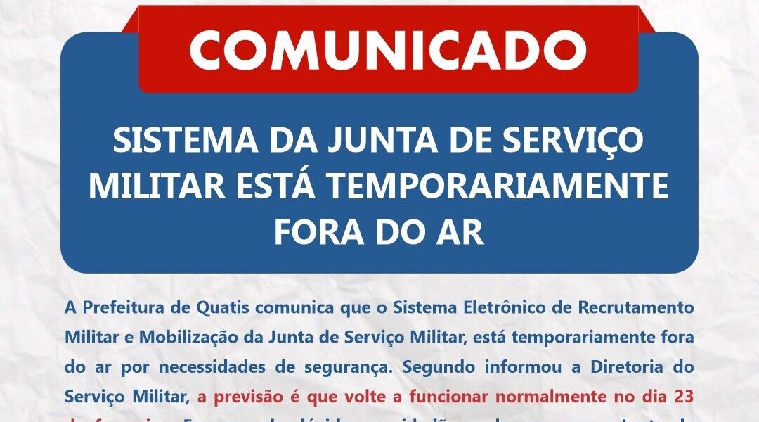A Prefeitura de Quatis comunica que o Sistema Eletrônico de Recrutamento Militar e Mobilização – SERMILMOB, da Junta de Serviço Militar, está temporariamente fora do ar por necessidades de segurança. Segundo informou a Diretoria do Serviço Militar (DSM) a previsão é que volte a funcionar normalmente no dia 23 de fevereiro. Em caso de dúvidas, o cidadão pode procurar a