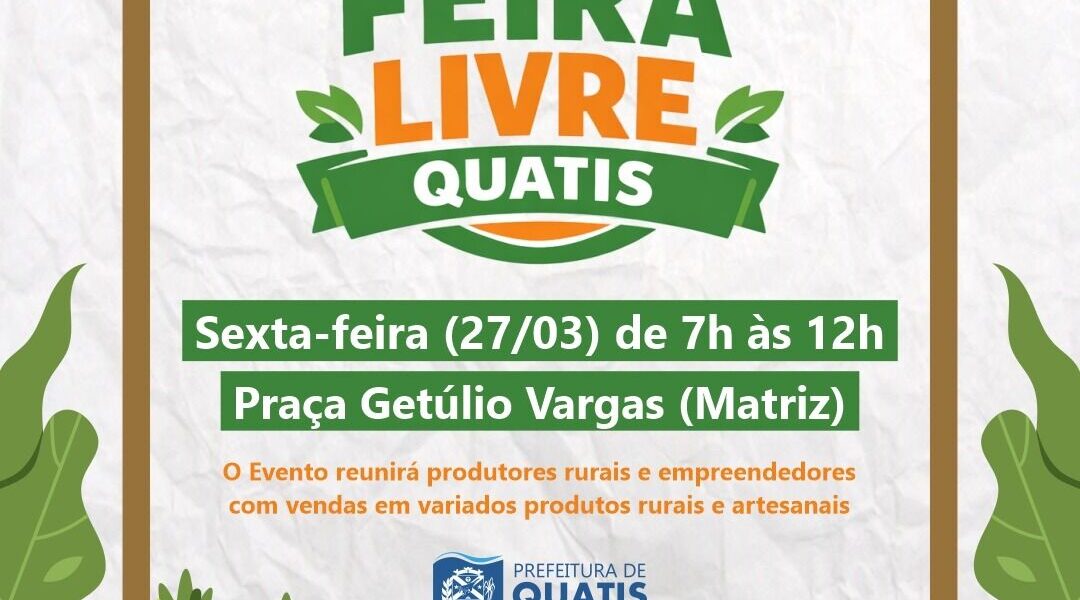 Acontece nesta sexta-feira (27), na Praça Getúlio Vargas, em Quatis, a Feira Livre da cidade. Iniciativa da prefeitura, o evento será realizado das 7h ao meio-dia, com diversas barracas de produtos agrícolas, entre frutas e alimentos artesanais. A entrada na Feira Livre é gratuita e aberta à população.