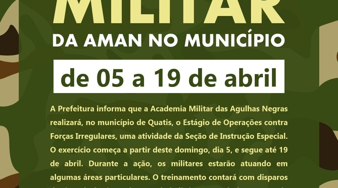 A Prefeitura de Quatis informa que a Academia Militar das Agulhas Negras – AMAN realizará, no município de Quatis, o Estágio de Operações contra Forças Irregulares, uma atividade da Seção de Instrução Especial (SIEsp). O exercício começa a partir deste domingo, dia 5, e segue até 19 de abril. Durante a ação, os militares estarão atuando em algumas áreas particulares