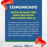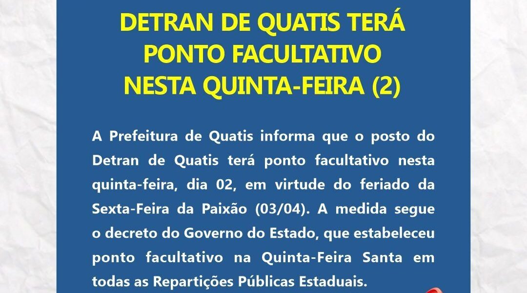 A Prefeitura de Quatis informa que o posto do Detran de Quatis terá ponto facultativo nesta quinta-feira, dia 02, em virtude do feriado da Sexta-Feira da Paixão (03/04). A medida segue o decreto do Governo do Estado, que estabeleceu ponto facultativo na Quinta-Feira Santa em todas as Repartições Públicas Estaduais. Para mais detalhes, acesse o Decreto Estadual n° 50.249 de