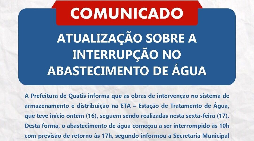 A Prefeitura de Quatis informa que as obras de intervenção no sistema de armazenamento e distribuição na ETA – Estação de Tratamento de Água, que teve início ontem (16), seguem sendo realizadas nesta sexta-feira (17). Desta forma, o abastecimento de água começou a ser interrompido às 10h com previsão de retorno às 17h, segundo informou a Secretaria Municipal de Infraestrutura