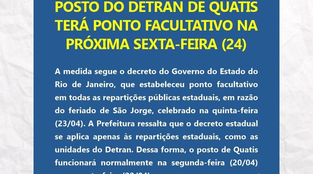 A Prefeitura de Quatis informa que o posto do Detran no município terá ponto facultativo na próxima sexta-feira (24/04). A medida segue o decreto do Governo do Estado do Rio de Janeiro, que estabeleceu ponto facultativo em todas as repartições públicas estaduais, em razão do feriado de São Jorge, celebrado na quinta-feira (23/04). A Prefeitura ressalta que o decreto estadual