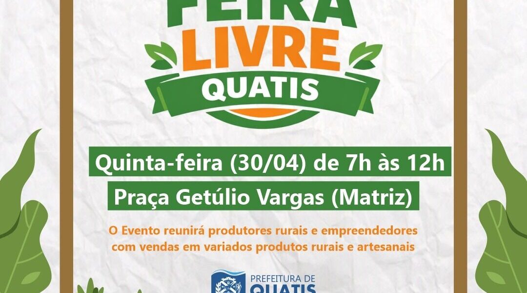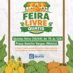 Nesta quinta-feira (30), será realizada mais uma edição da Feira Livre de Quatis, promovida pela Prefeitura. O evento acontece das 7h às 12h, na Praça Getúlio Vargas (Praça da Matriz), no centro da cidade, reunindo as tradicionais barracas com produtos agrícolas frescos e de qualidade. Excepcionalmente nesta semana, a feira será realizada na quinta-feira, e não na sexta-feira, como de