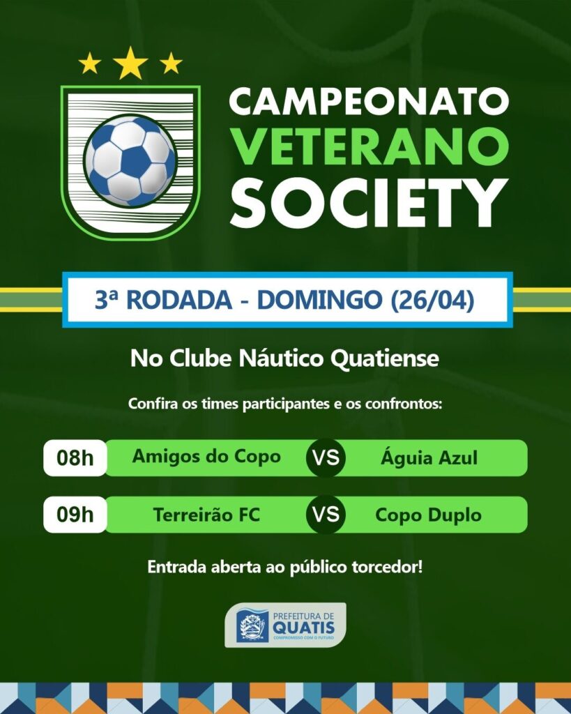 Neste domingo, dia 26/04, acontece a 3ª e última rodada do Campeonato Veterano de Futebol Society. As partidas começam a partir das 8h no Clube Náutico Quatiense.