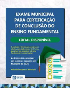 Já está disponível o edital que regulamenta o Exame Municipal para Certificação de Conclusão do Ensino Fundamental da Rede Municipal de Ensino de Quatis. A avaliação é direcionada para jovens e adultos, com idade mínima de 15 anos, que ainda não concluíram o Ensino Fundamental na idade regular ao nível de ensino. As inscrições para a prova começam em janeiro