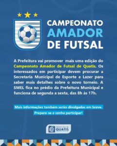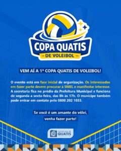 Uma iniciativa da Prefeitura de Quatis, por meio da Secretaria Municipal de Esporte e Lazer (SMEL), vem aí a 1ª Copa Quatis de Voleibol. O evento está em fase inicial de organização. Os interessados em fazer parte devem procurar à SMEL e manifestar interesse. A secretaria fica no Centro Administrativo 25 de Novembro (prédio da Prefeitura Municipal) e funciona de