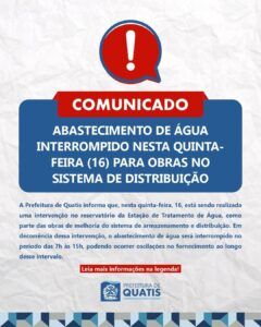 A Prefeitura de Quatis informa que, nesta quinta-feira, 16, está sendo realizada uma intervenção no reservatório da Estação de Tratamento de Água, como parte das obras de melhoria do sistema de armazenamento e distribuição. Em decorrência dessa intervenção, o abastecimento de água será interrompido no período das 7h às 15h, podendo ocorrer oscilações no fornecimento ao longo desse intervalo. Durante