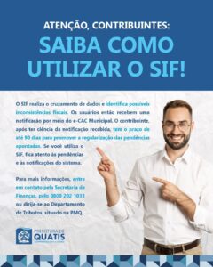 A Prefeitura de Quatis, por meio da Secretaria Municipal de Finanças (SMF), vem divulgar um aviso aos contribuintes sobre o Sistema de Inteligência Fiscal (SIF). O SIF realiza o cruzamento de dados e identifica possíveis inconsistências fiscais. Os usuários então recebem uma notificação por meio do e-CAC Municipal. O contribuinte, após ter ciência da notificação recebida, tem o prazo de