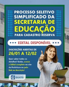A Prefeitura de Quatis vai abrir na próxima segunda-feira, dia 26, as inscrições para o Processo Seletivo Simplificado por tempo determinado e formação de cadastro reserva da Secretaria Municipal de Educação (SME). As inscrições vão até 12 de fevereiro, e acontecerão das 9h às 11h30 e das 13h30 às 16h, na Secretaria de Educação, situada no Centro Administrativo 25 de