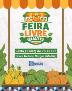 Evento reunirá produtores rurais e empreendedores com vendas em variados produtos rurais e artesanais A Prefeitura de Quatis vai realizar, na próxima sexta-feira (13), a 1ª Feira Livre da cidade. Iniciativa da Secretaria Municipal de Desenvolvimento Econômico Urbano e Rural, o objetivo é valorizar produtores rurais e também fomentar a economia local, através do comércio rural e empreendedor. O evento