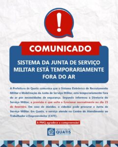 A Prefeitura de Quatis comunica que o Sistema Eletrônico de Recrutamento Militar e Mobilização – SERMILMOB, da Junta de Serviço Militar, está temporariamente fora do ar por necessidades de segurança. Segundo informou a Diretoria do Serviço Militar (DSM) a previsão é que volte a funcionar normalmente no dia 23 de fevereiro. Em caso de dúvidas, o cidadão pode procurar a