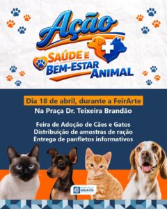 Um sabadão especial dedicado à saúde animal! Pelo “Abril Laranja”, mês de combate aos maus-tratos e à crueldade animal, a Prefeitura vai estar com uma ação dedicada à saúde animal, neste sábado (18/04), durante a FeirArte, na Praça Dr. Teixeira Brandão. O dia terá:Feira de Adoção de Cães e Gatos, em parceria com o CIRACDistribuição de amostras de raçãoEntrega de