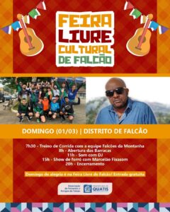 Domingo é dia de Feira Livre de Falcão! Neste domingo (01/03), o distrito de Falcão, em Quatis, sediará mais uma edição da Feira Livre Cultural. O evento acontece a partir das 7h30 e vai até às 20 horas com um dia inteiro de programação. Confira o que vai rolar: 7h30 – Treino de Corrida com a equipe Falcões da Montanha8h