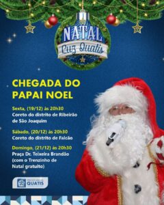 O município de Quatis vai receber, neste final de semana, a presença do papai noel. O bom velhinho retorna à cidade após sua participação na abertura do Natal Luz Quatis 2025, realizado pela prefeitura, no último dia 14. Desta vez, ele estará presente de 19 à 21 de dezembro, nos distritos de Ribeirão de São Joaquim e Falcão, e também