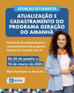 A Prefeitura de Quatis já lançou o decreto que regulamenta o programa Geração do Amanhã para o ano letivo de 2026. O serviço concede transporte gratuito para estudantes do município em universidades e cursos de instituições localizadas em cidades vizinhas. O período de inscrições começa no dia 5 de janeiro e segue até 16 de março, sendo realizadas presencialmente no