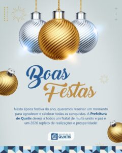 Nesta época festiva do ano, queremos reservar um momento para agradecer e celebrar todas as conquistas. A Prefeitura de Quatis deseja a todos um Natal de muita união e paz e um 2026 repleto de realizações e prosperidade!