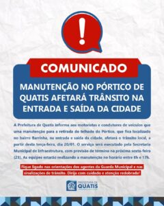Atenção! A Prefeitura de Quatis informa aos motoristas e condutores de veículos que uma manutenção para a retirada do telhado do Pórtico, que fica localizado no bairro Barrinha, na entrada e saída da cidade, afetará o trânsito local, a partir desta terça-feira, dia 20/01. O serviço será executado pela Secretaria Municipal de Infraestrutura (SMI), com previsão de término na próxima