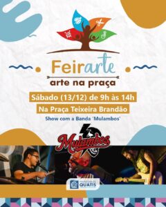 A Prefeitura de Quatis vai realizar, neste sábado (13), mais uma edição da FeirArte, a tradicional feira de artesanatos da cidade. Esta será uma edição extra, seguido do último final de semana, que recebeu a primeira edição de dezembro. A iniciativa faz uma quebra no calendário que estabelece a realização do evento no 1º e no 3º sábado do mês,