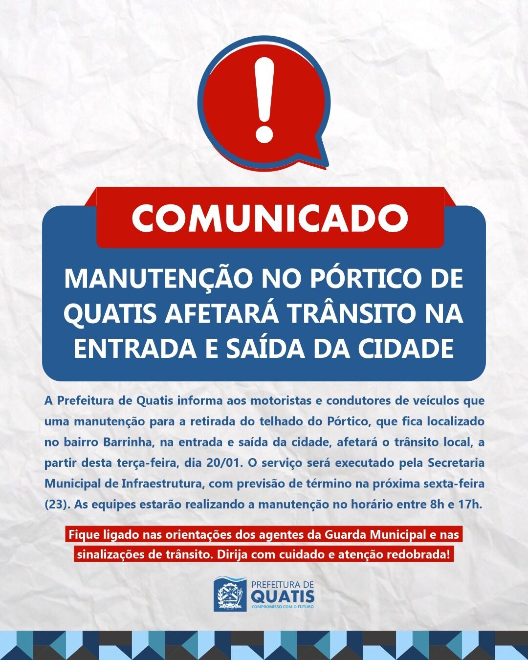 Comunicado: Manutenção do telhado do pórtico de Quatis afetará trânsito na entrada e saída da cidade