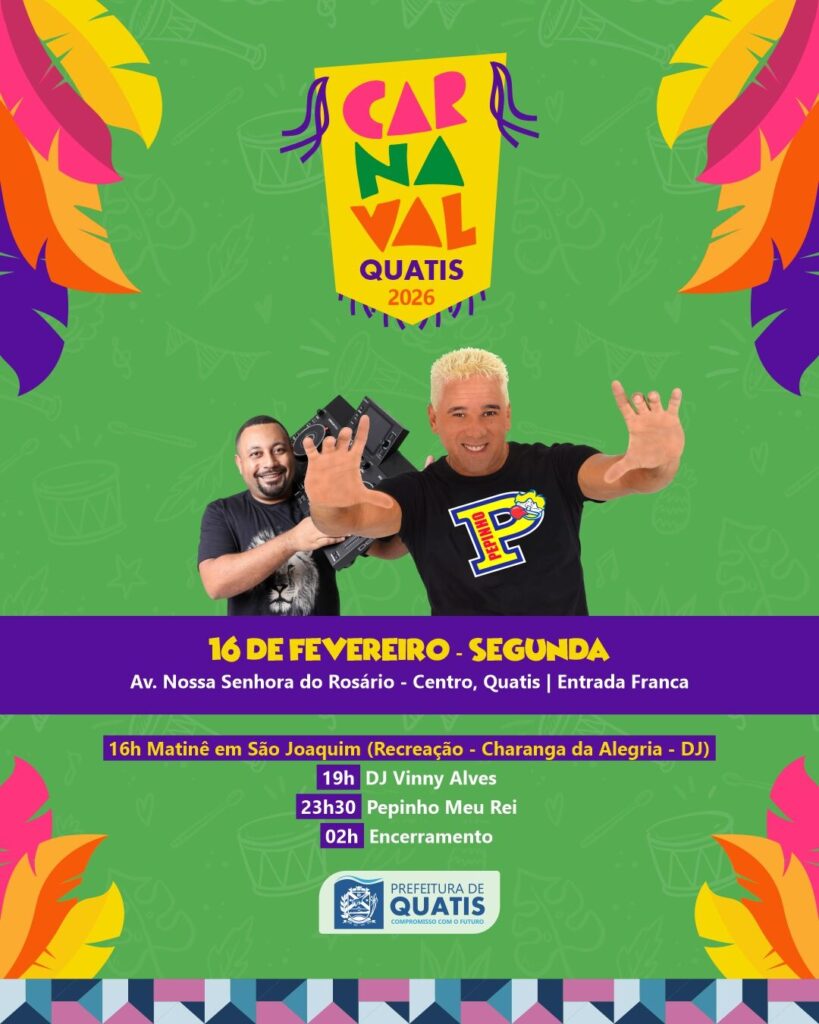 A noite terá o retorno de Pepinho Meu Rei, que já se apresentou em Quatis, além de matinê para a criançada no distrito de São Joaquim. Confira o que vai rolar na segundona de Carnaval Quatis 2026: