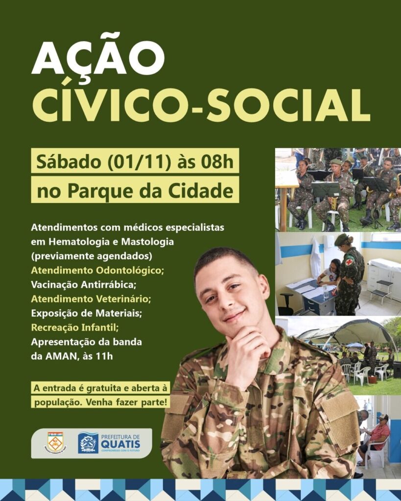 O Parque da Cidade do bairro Jardim Polastri, em Quatis, vai receber, neste sábado (1º), a Ação Cívico-Social da Academia Militar das Agulhas Negras (AMAN), em parceria com a prefeitura.