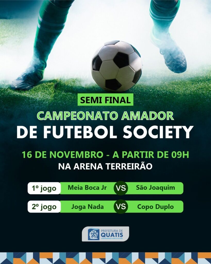 No próximo domingo, dia 16, acontecem os jogos das semifinais do Campeonato Amador de Futebol Society de Quatis. Quatro times entram em campo em busca por uma vaga na grande final. As partidas começam a partir das 9 horas, na Arena Terreirão, no bairro Jardim Independência. Veja os confrontos: