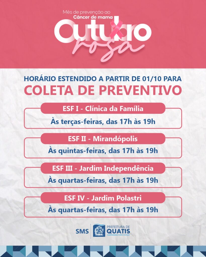Visando a campanha Outubro Rosa, a Prefeitura de Quatis vai ampliar, a partir do próximo mês, o horário para coleta de exames preventivos. O objetivo, segundo a Secretaria de Saúde, é garantir maior disponibilidade para a população na realização dos exames no mês em que se celebra o combate ao câncer de colo de útero. Os atendimentos ocorrerão toda terça, quarta e quinta-feira, das 17h às 19 horas, de acordo com um calendário escalonado. Confira: