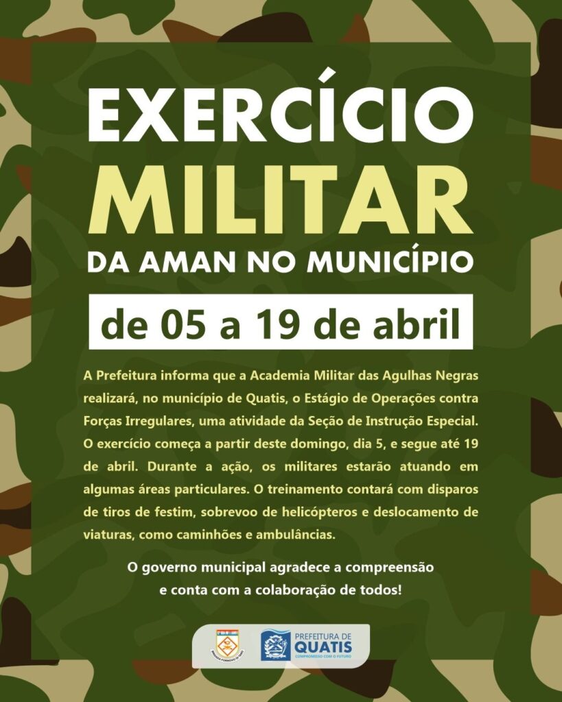A Prefeitura de Quatis orienta à população para que fique informada e atenta às atividades do Exército Brasileiro na cidade. O governo municipal agradece a compreensão e conta com a colaboração de todos!