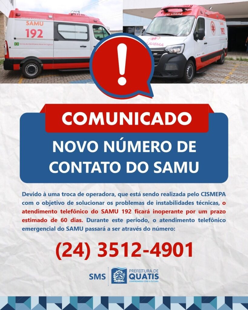 A Prefeitura de Quatis informa que, devido à uma troca de operadora, que está sendo realizada pelo Consórcio Intermunicipal de Saúde do Médio Paraíba (CISMEPA), com o objetivo de solucionar os problemas de instabilidades técnicas, o atendimento telefônico do SAMU 192 ficará inoperante por um prazo estimado de 60 dias.
