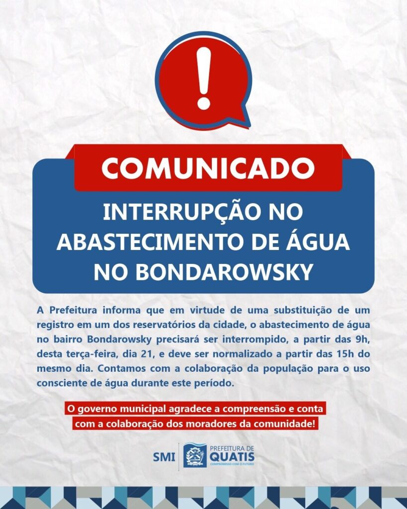 A Prefeitura de Quatis informa que em virtude de uma substituição de um registro em um dos reservatórios da cidade, o abastecimento de água no bairro Bondarowsky precisará ser interrompido, a partir das 9 horas, desta terça-feira, dia 21. Segundo a Secretaria Municipal de Infraestrutura (SMI), o abastecimento deve ser normalizado a partir das 15h do mesmo dia.