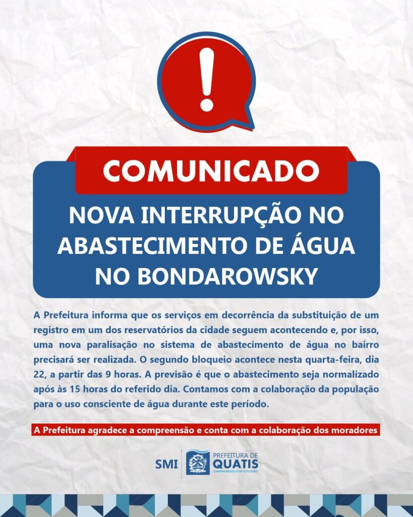 Em decorrência da substituição de um registro em um dos reservatórios da cidade, que interrompeu o abastecimento de água no bairro Bondarowsky, nesta terça-feira (21), como já havia sido comunicado pelo governo municipal, a Prefeitura de Quatis informa que os serviços seguem acontecendo e, por isso, uma nova paralisação no sistema de abastecimento de água no bairro precisará ser realizada.