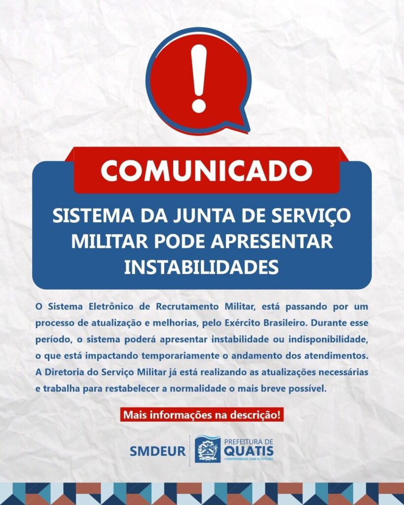 A Prefeitura de Quatis comunica que o Sistema Eletrônico de Recrutamento Militar (SERMIL), da Junta de Serviço Militar, está passando por um processo de atualização e melhorias, pelo Exército Brasileiro. Durante esse período, o sistema poderá apresentar instabilidade ou indisponibilidade em algumas funcionalidades, o que está impactando temporariamente o andamento dos atendimentos.