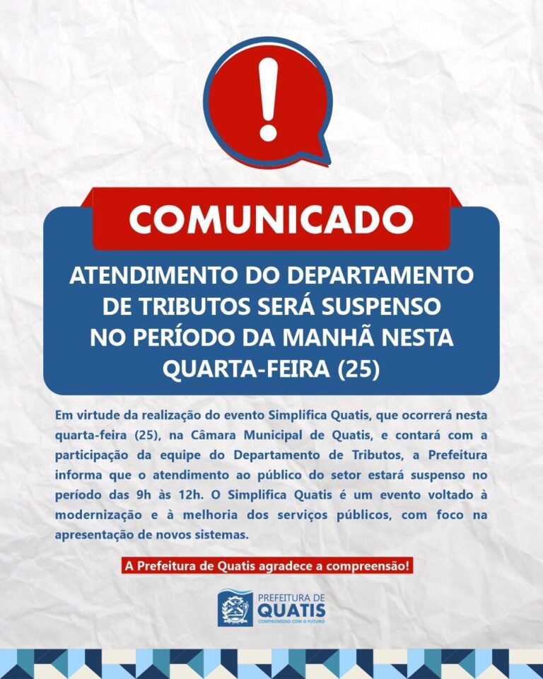 Comunicado: Atendimento do Departamento de Tributos será suspenso no período da manhã nesta quarta-feira (25)