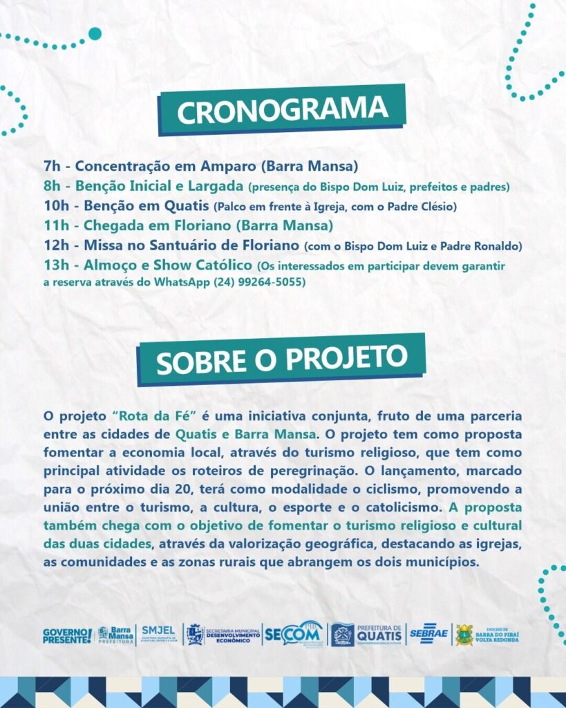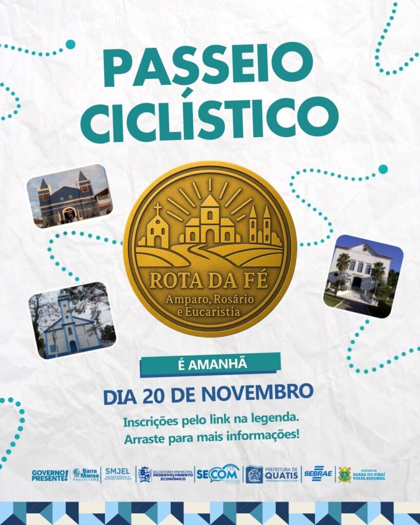 Nosso Passeio Ciclístico de Lançamento do Rota da Fé, em parceria com a Prefeitura de Barra Mansa, está chegando! Um momento que será marcado por muita devoção e espírito esportivo e que acontece nesta quinta-feira, 20, no feriadão.