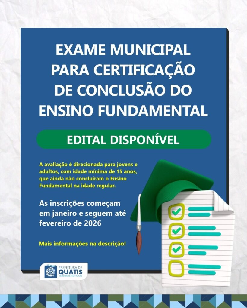 Já está disponível o edital que regulamenta o Exame Municipal para Certificação de Conclusão do Ensino Fundamental da Rede Municipal de Ensino de Quatis.