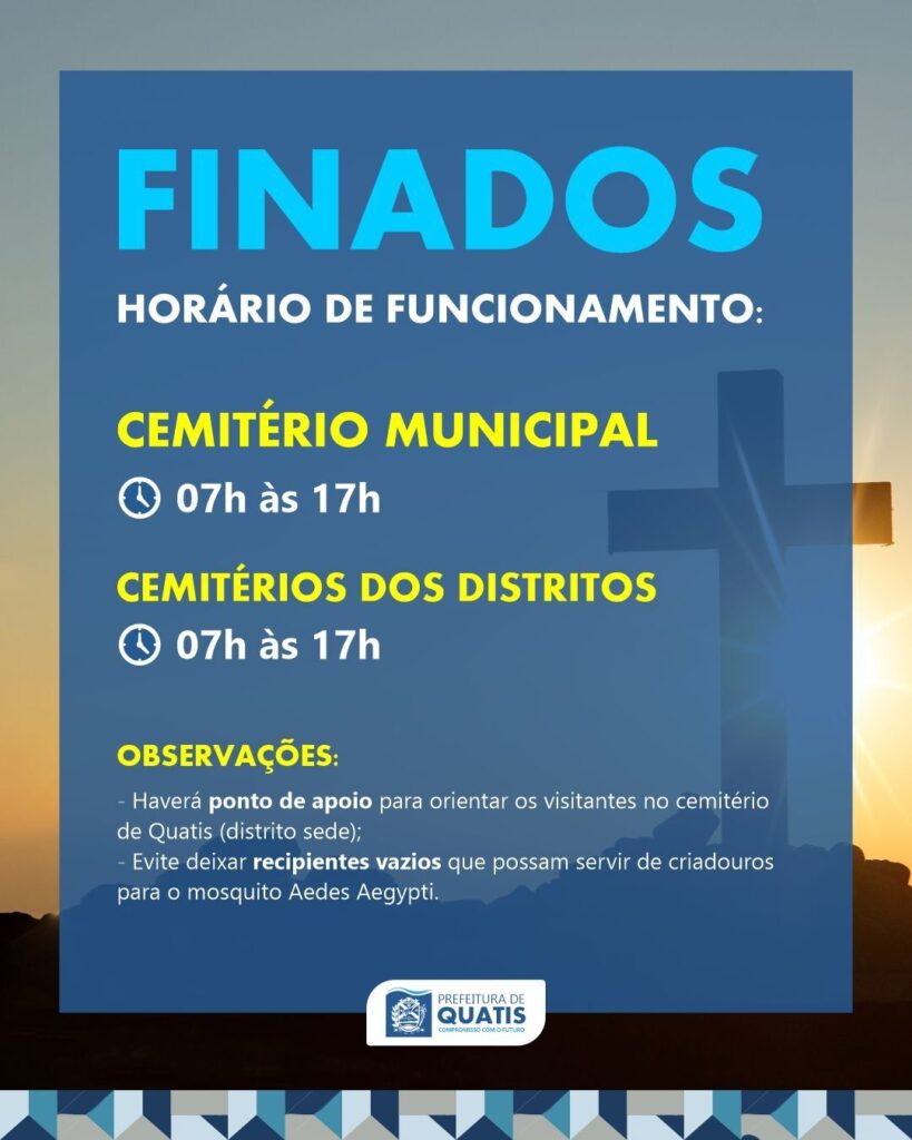 A Prefeitura Municipal de Quatis informa que neste feriado de Finados, 02 de novembro, os cemitérios do município funcionarão das 07h às 17h. Ressaltamos que haverá ponto de apoio para orientar os visitantes do Cemitério de Quatis.
